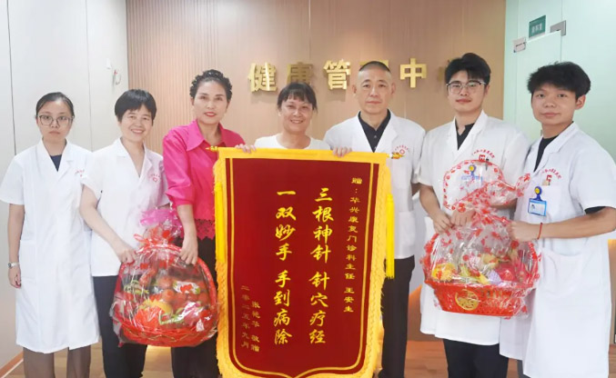 近日,我院门诊康复科王安生主任收到肩周炎患者赠送的锦旗与花篮:锦旗上书“三根神针 针穴疗经 一双妙手 手到病除”,字里行间满是患者对其精湛医术的感激之情。